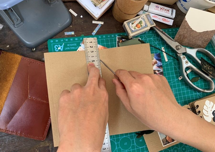 Dùng đầu bút hết mực (hoặc vật tương tự) và "cấn" một đường thẳng, sau đó gấp lại. Cách này tuy đơn giản nhưng giúp giấy vào phom và đường thẳng, giúp thiệp không bị cong vênh hay méo mó khi gấp.