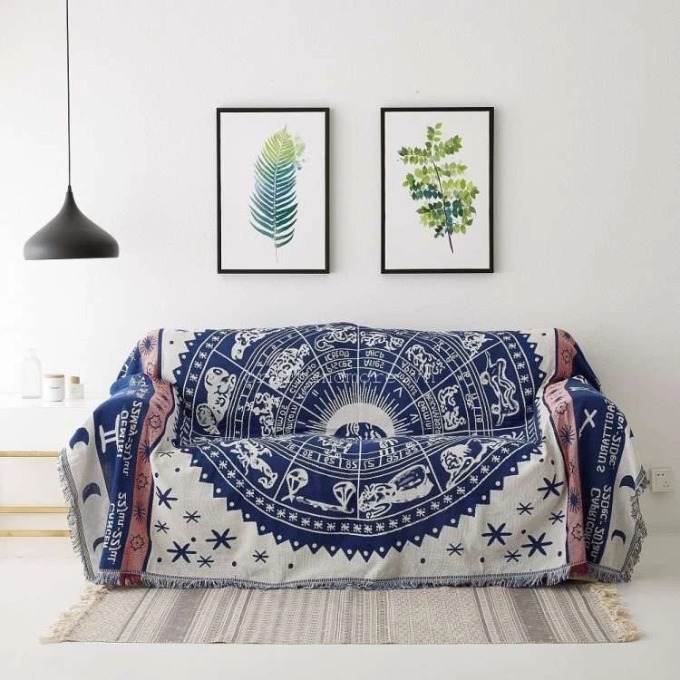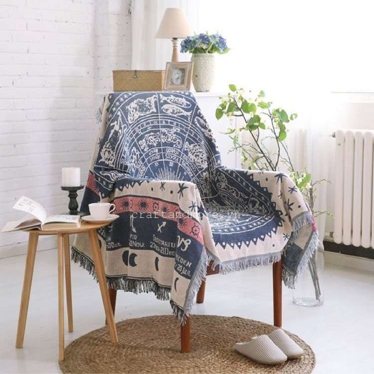 Thảm dệt cao cấp cung hoàng đạo với màu xanh nổi bật trên nền vải trắng ngà cùng các họa tiết cung hoàng đạo. Một mẫu thảm trải sàn độc đáo, mới lạ phù hợp cho các không gian phòng khách, phòng ngủ khách sạn, homestay....Không chỉ giúp thể hiện cá tính của chủ nhân căn nhà, thảm sofa, thảm vintage còn giúp không gian sống trở nên lãng mạn. Đặc biệt chất liệu rất thân thiện, an toàn giúp bảo vệ sức khỏe, dễ dàng vệ sinh là yếu tố khiến người dùng đều hài lòng khi đến với thảm nhà Craft & More.