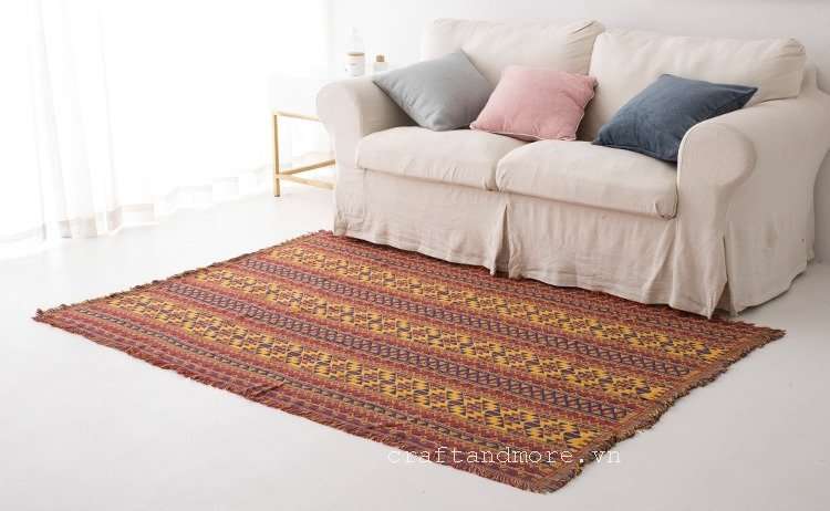 Họa tiết thổ cẩm luôn mang một giá trị bản sắc dân tộc nổi bật là các đường nét đối xứng lặp lại tạo ra sự hài hòa cho tấm thảm. Thiết kế tinh xảo, bắt mắt, chất vải mềm mịn. Những bạn nào là tín đồ của style Vintage thì không nên bỏ qua sản phẩm độc đáo này nhé!