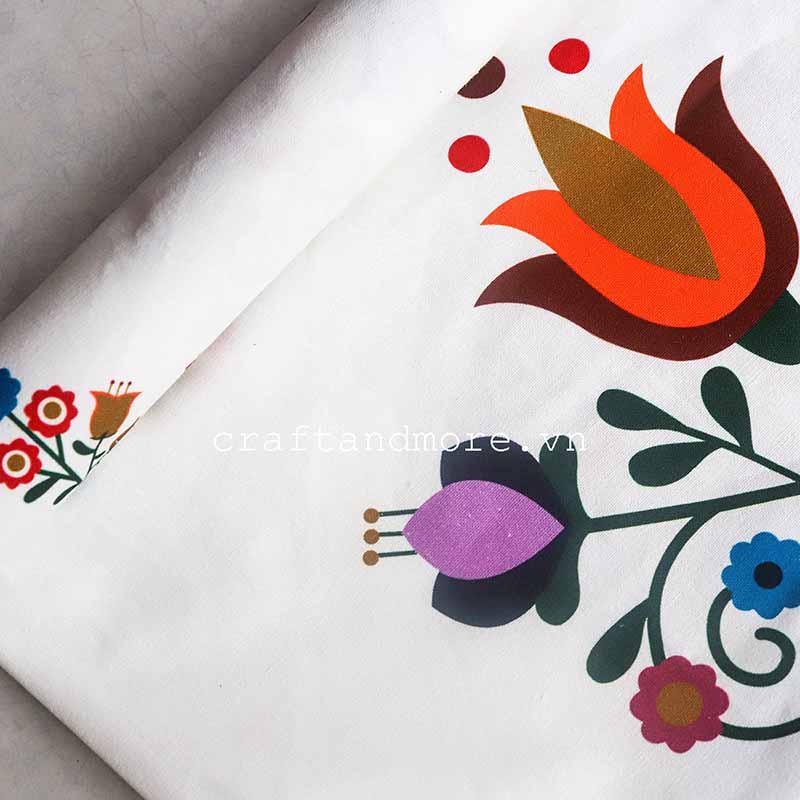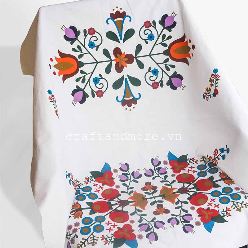 Vải hoa văn phong cách Hungarian với nền vải trắng sáng, sợi vải mịn, đẹp in họa tiết cổ điển màu nổi bật, sang trọng.