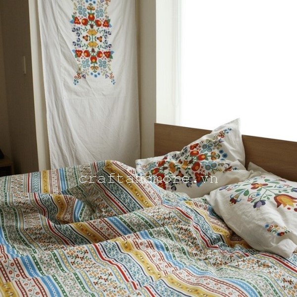 Vải giữ màu cực tốt, giặt ủi thoải mái nên vải cũng phù hợp may khăn trải bàn và các vật dụng khác như tấm phủ, khăn ăn. Vải có màu sắc tươi sáng với các khối họa tiết theo khổ vải 1m55 nên rất dễ may và phối viền ren hoặc dùng với table runner trang trí.