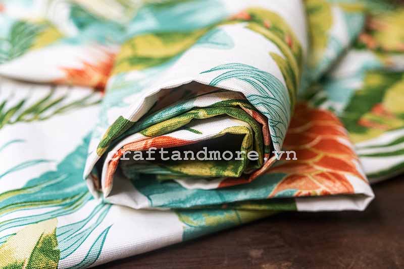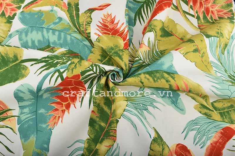 Vải trang trí nội thất họa tiết phong cách vintage nhiệt đới, sợi vải mịn, đẹp in họa tiết lá tropical cùng tone màu xanh cam nổi bật giúp căn phòng bạn trông ấm áp và gần gũi hơn.