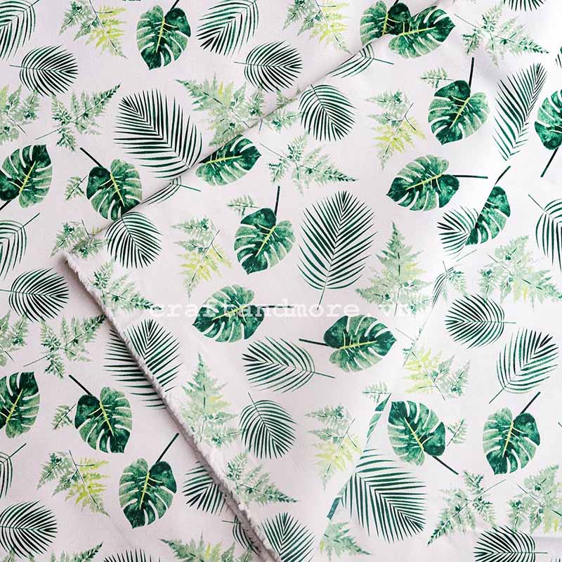 Vải trang trí với nền vải trắng xanh , sợi vải mịn, đẹp in họa tiết lá sẽ hợp gu thẩm mỹ với người mê phong cách Tropical.